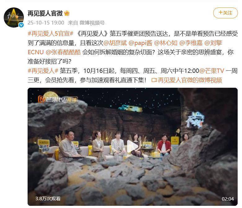 《再见爱人》是芒果TV推出的婚姻纪实观察真人秀,该节目采用纪实手法记录三对面临婚姻危机的夫妻,展露更多婚姻本相。据节目组官博消息,10月16日起,《再见爱人5》每周四、周五、周六中午12:00@芒果TV 一周三更。林心如与胡彦斌、papi酱、李维嘉等共同剖析三对夫妻(邓莎夫妇、李施嬅情侣、何美延夫妇)的婚姻危机。